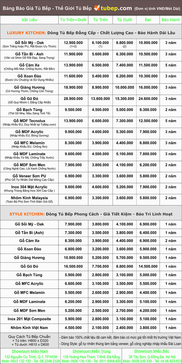 Đây là Bảng Báo Giá mới nhất, được cập nhật thường xuyên và áp dụng trên Hệ thống Showroom toàn quốc của Thế Giới Tủ Bếp – TuBep.com (Chuyên Nghiệp và Nổi Tiếng – Quy Trình Hàng Đầu – Bảo Hành Dài Lâu – Chăm Sóc Tận Tình – Giá Rẻ Nhất Việt Nam So Với Chất Lượng Cam Kết – Ở Đâu Rẻ, Chúng Tôi Rẻ Hơn)
